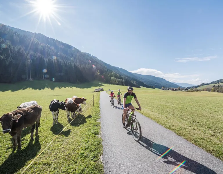 Cycle along the picturesque Val Casies/Gsiesertal valley bike route through forests and meadows, passing by authentic farms. Enjoy the unspoiled nature and idyllic villages along the way. The route starts in Monguelfo/Welsberg and follows the Val Casies/Gsiesertal valley Brook, passing through Colle/Pichl and S.Martino/St. Martin, before ending with a gentle uphill climb in S.Maddalena/St. Magdalena.
